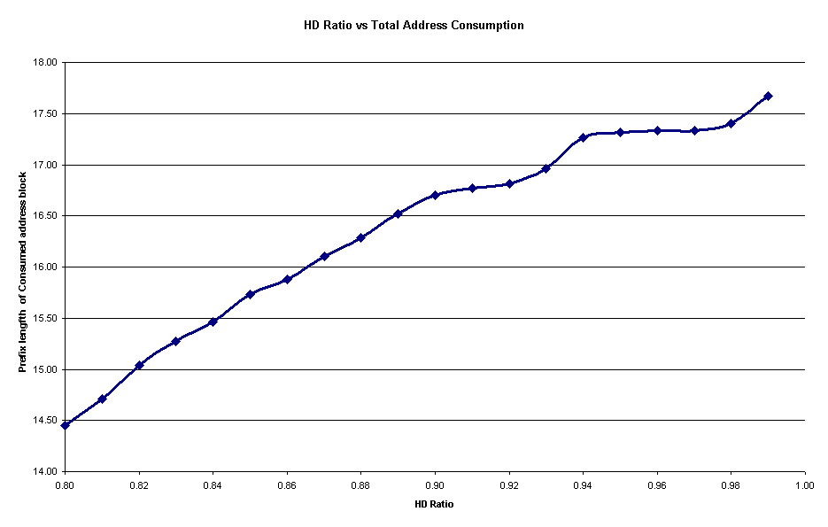 In attempting to assess the impact of potentially changing the HD ratio to a lower value, it is useful to assess this using some models of address comsumption data. The results described here use the IPv4 allocation data as published by the Regional Internet Registries [reference to "delegated" files]. The simulation work assumes that the IPv4 delegation data uses an IPv4 /32 for each end customer, and that assignments have been made based on an 80% density metric in terms of assumed customer count. The customer count is then used as the basis of an IPv6 address allocation, using the HD Ratio tomap from a customer count to the size of an address allocation.