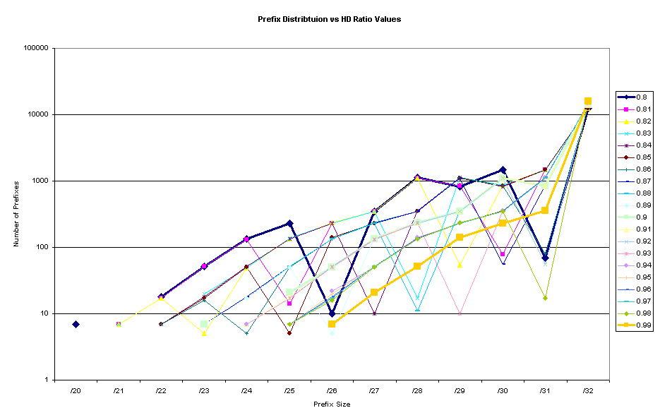 As shown in this figure it is possible to select an HD-Ratio value that models IP level structures in a fashion that behaves more consistently for very large deployments. In this case the choice of an HD Ratio of 0.94 is consistent with a limited level model of up to 5 levels of hierarchy with a metric of 75% density at each level. This correlation is indicated in Table 3 of Attachment A.