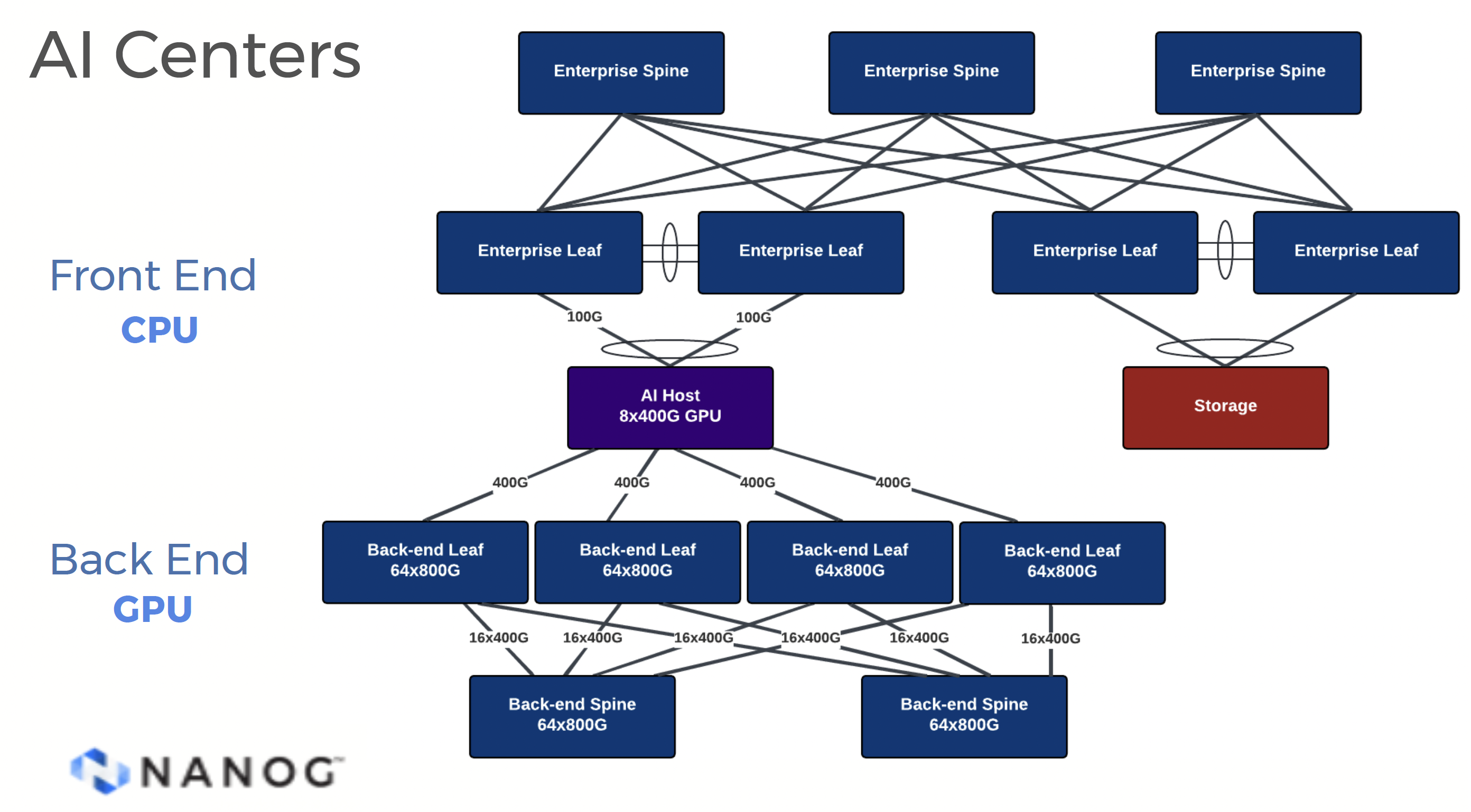 The internal communications environment in these AI Data Centres use a two-dimensional framework, where the "North/South" network provides the external interface, typically implemented as a 2 x 400 Gbps switched system, and an "East/West" network for data exchange between GPUs, typically implemented as an InfiniBand or UEC Ethernet at 8 x 800Gbps.