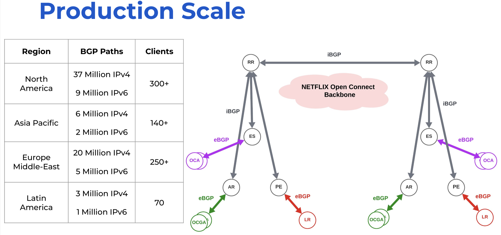 It perhaps goes without saying, but obviously Network is a major player in the content streaming sector at a global level. They deliver traffic to end users with an aggregate capacity of terrabits per second, operating some 19,000 Netflix Open Connect service appliances installed in IXPs and various ISP networks, across 175 countries. They operate some 400 PoPs, and in the routing system they xmanage some 20,000 eBGP sessions, peering with more than 2,000 different ASNs.