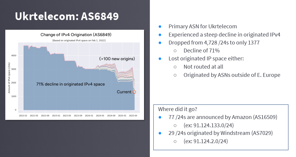 Doug Madory reported on his efforts of tracking of the movement of IPv4 addresses that were held by IPs in the Ukraine since 2022. The presentation noted that large amounts of IPv4 space, formerly originated by prominent Ukrainian network providers, have migrated out of the country, resulting in a 20% reduction in the Ukraine's footprint in the global routing table.