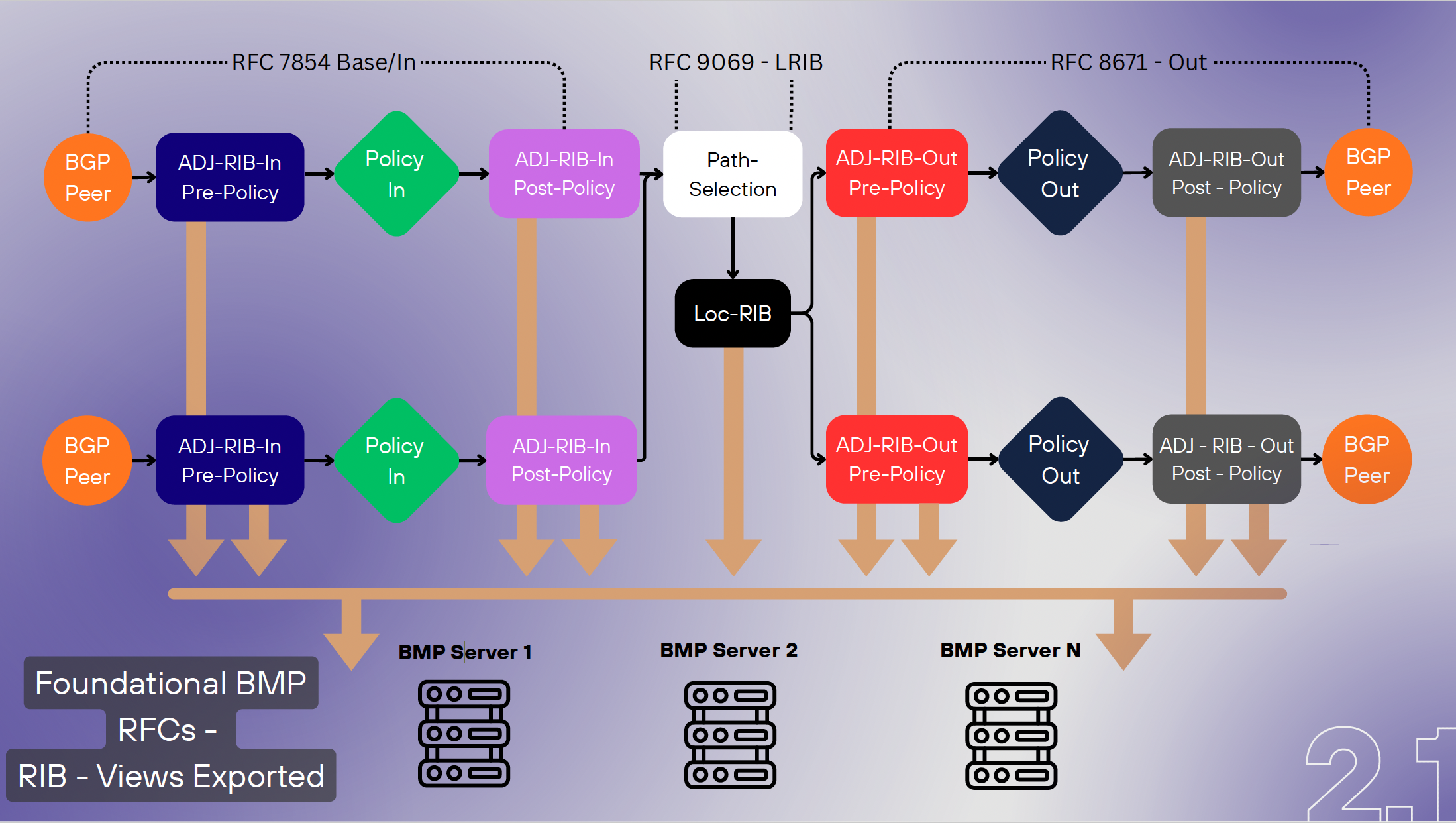BMP exports a BGP speaker's control state with an associated metadata stream that provides a commentary on the local changes to control plane of the BGP system enabling data aggregation and centralized data collection tasks. BMP functions are aligned to the generic internal structure of a BGP engine, as shown in Figure 6.