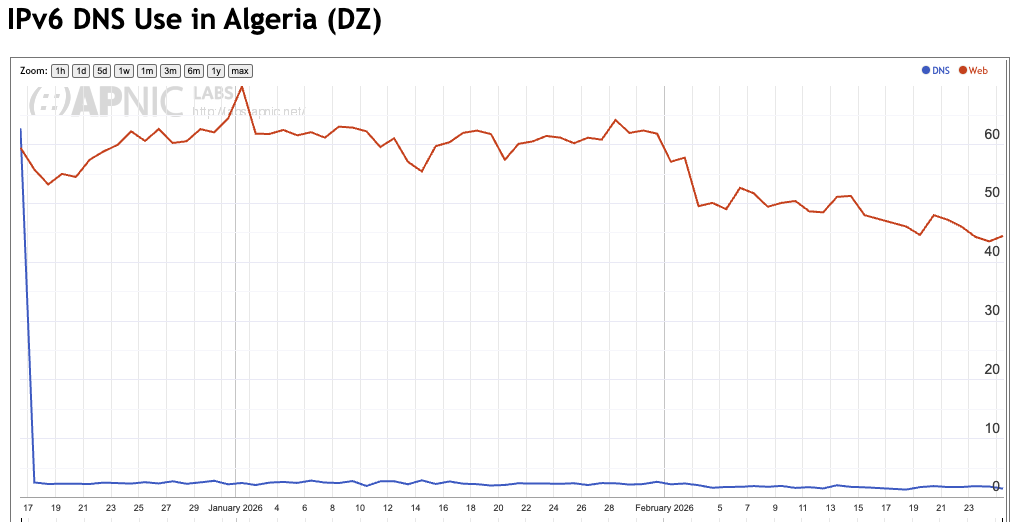 There are a number of countries in Africa that report a consistent, but anomalous behaviour in this measurement where the Web-based measurement is consiustently higher than the DNS-based measurement. A good example is Algeria (Figure 5), although a similar behaviour is apparent in Libya, Egypt, Mauritania, Liberia and a number of other mostly African countries (See https://stats.labs.apnic.net/v6odns).