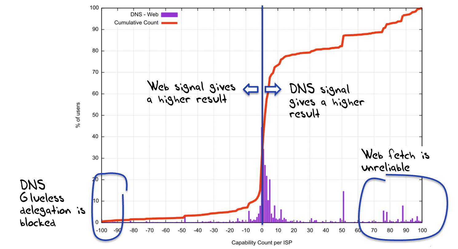The results are certainly interesting. The DNS-only measurement is more robust in that we see the DNS operate through the glueless delegation in a more reliable manner. There are, however, networks where there appears to be blocking of resolving domain names where there are no glue records (predominately in North Africa), and this blocking behaviour appears to affect some 3% of the total user count.